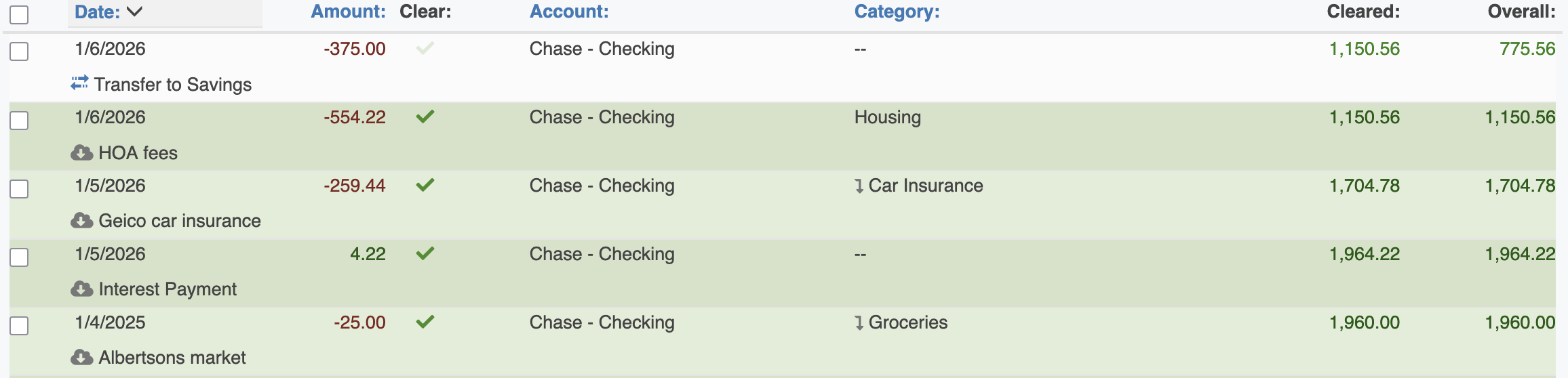 After transactions are downloaded to your account, they appear with a cloud icon next to the description in the Transaction Register. This icon helps differentiate synced transactions from those you manually entered.