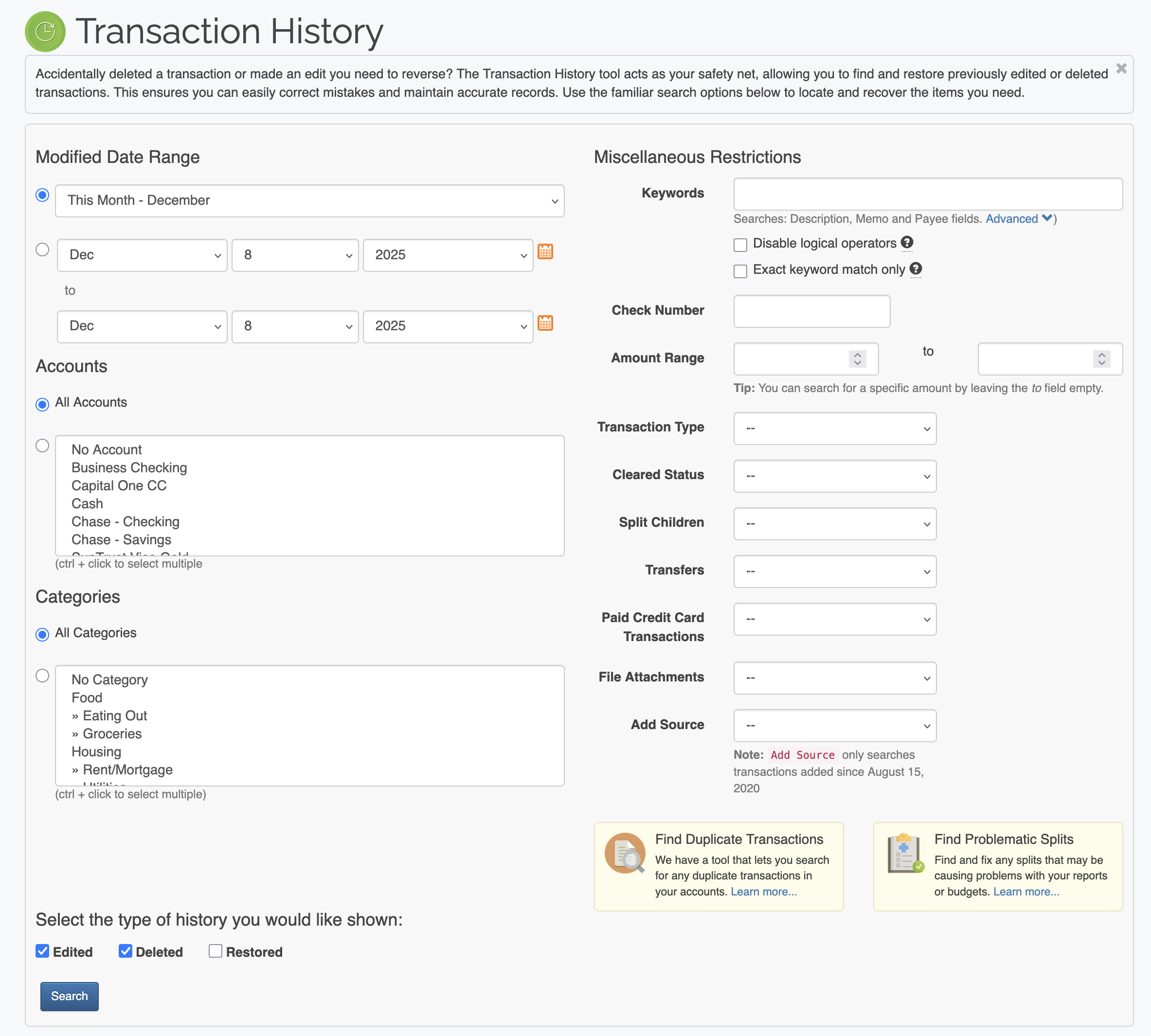 Transaction History (undo deleted or edited transactions) |